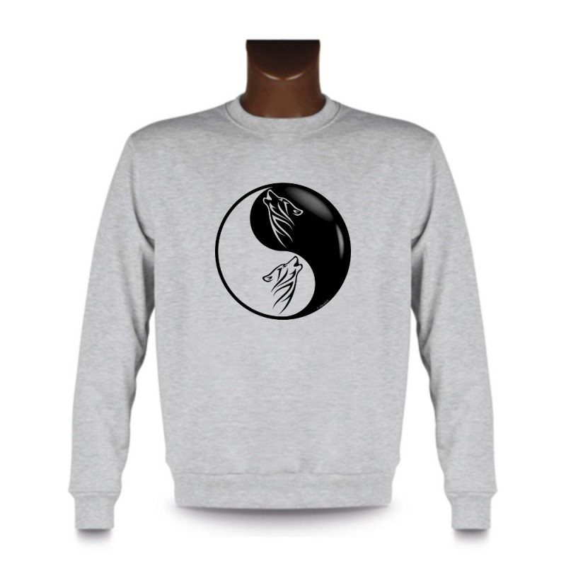 Men's fashion Sweat illustrated with the head of a tribal Wolf inside the Yin-Yang symbol.