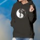 A lady's fashion model Cotton Hoodie with a cat's head, designed in the style of a tribal tattoo, inside Yin and Yang