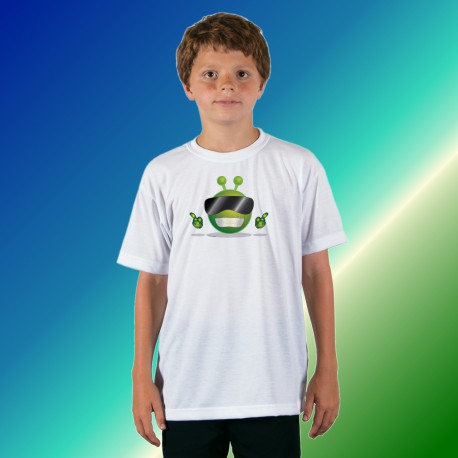 Youth fashion t-shirt, illustrated with a mega cool alien smiley, wearing sunglasses