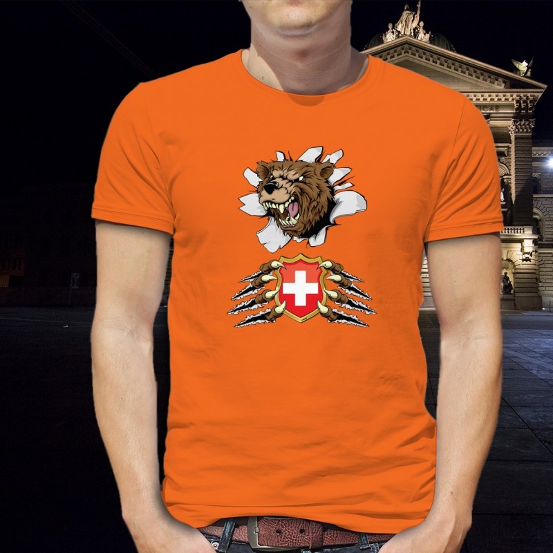 100% cotton T-shirt with the head of a snarling bear tearing the T-shirt and holding the coat of arms of Switzerland between its claws