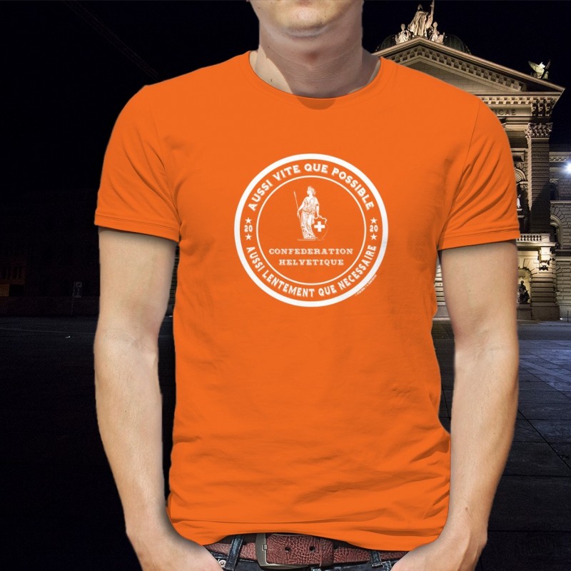 100% cotton T-shirt illustrated with an emblem containing the mention ✚ Aussi vite que possible ✚ and a representation of Lady Helvetia