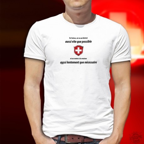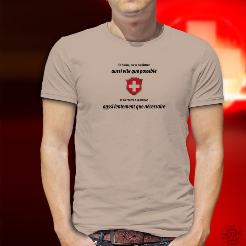 Men's Fashion T-shirt illustrated with "En Suisse on va au bistrot aussi vite que possible ✚