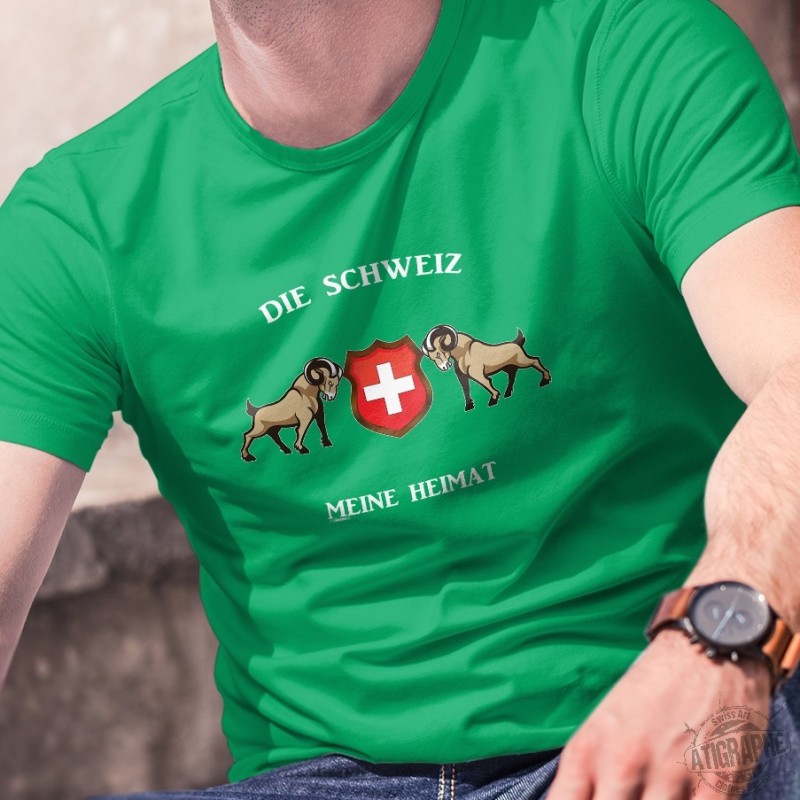 100% cotton T-shirt with the quote ✚ Die Schweiz, meine Heimat ✚ and two Alpine Ibex
