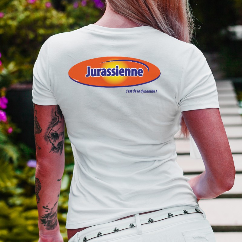 Women's fashion T-Shirt illustrated with the quotation "Jurassienne, c'est de la dynamite !" And a pastiche of the logo "Ovomaltine®" famous brand of spreads