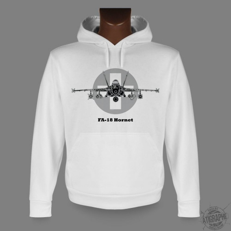 This white hoodie is illustrated with the silhouette of an FA-18 Hornet with Swiss Airforce coat of arms in the background.