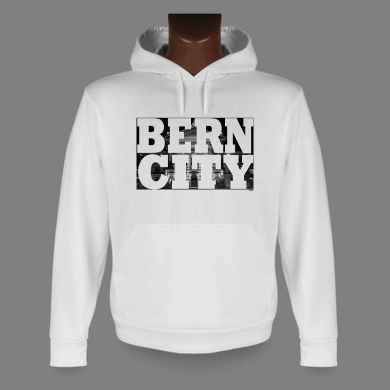 Hooded Sweat illustrated with letters BERN CITY and the Federal Palace in the background. A mark of respect for this city which is the capital of Switzerland and the canton of Bern