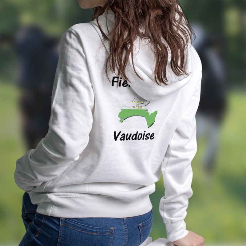 White hooded sweatshirt, illustrated with the Vaudois borders inlaid by the Vaudois flag and the slogan "Fière d'être Vaudoise"