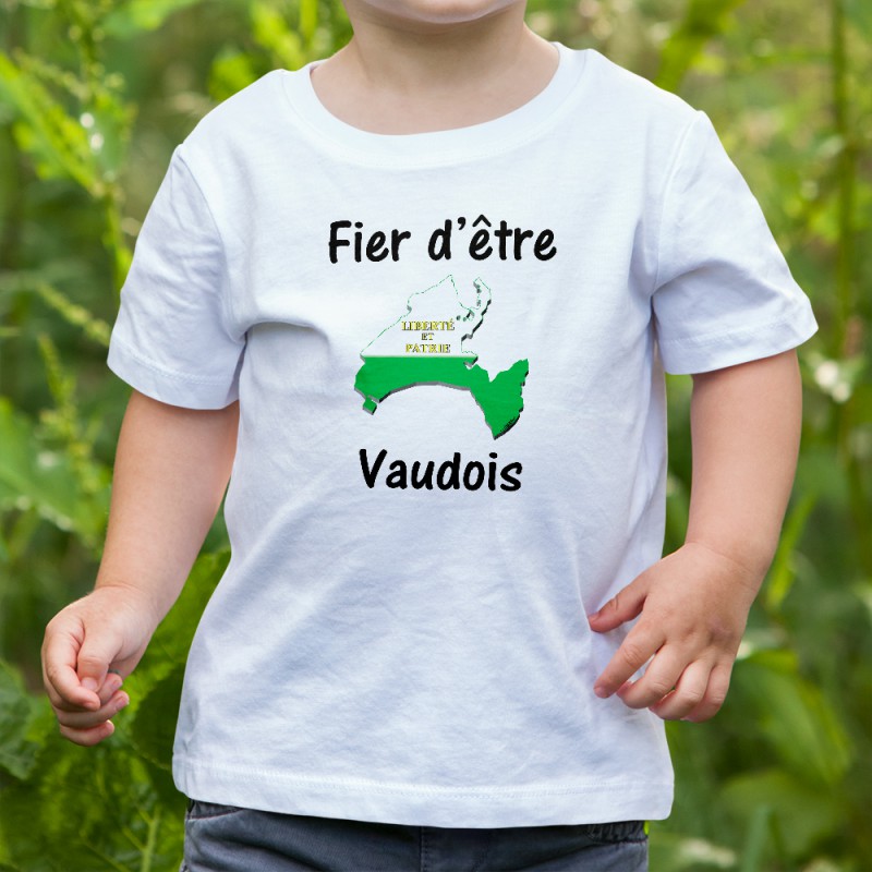 T-shirt for children from 2 to 14 years old, illustrated with the Vaud borders inlaid by the Vaudois flag and the slogan "Fier d'être Vaudois". 2 colors available