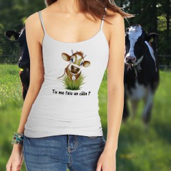 Débardeur à la coupe très féminine, illustré d'une jolie vachette romantique et de la citation "Tu me fais un câlin ?"