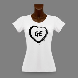 T-shirt à la coupe très féminine, illustré au pinceau d'un coeur et des lettres GE pour la ville et canton de Genève