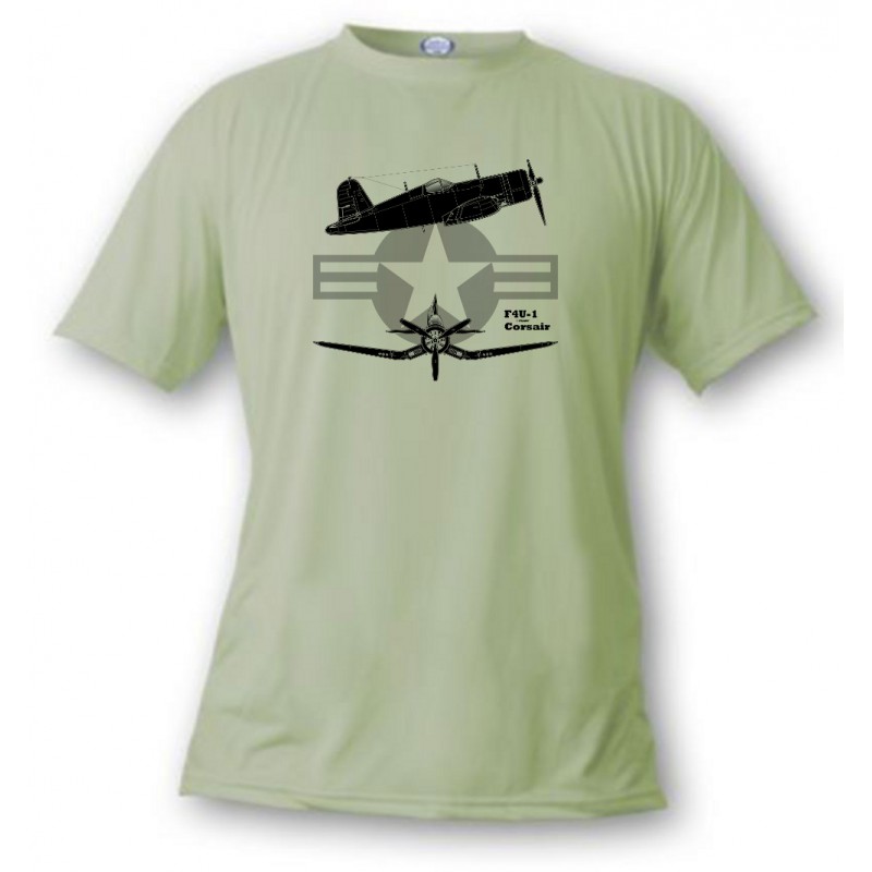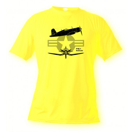 T-shirt illustré de la silhouette de l'avion de chasse - F4U-1 Corsair et des armes de l' USAF en arrière-plan