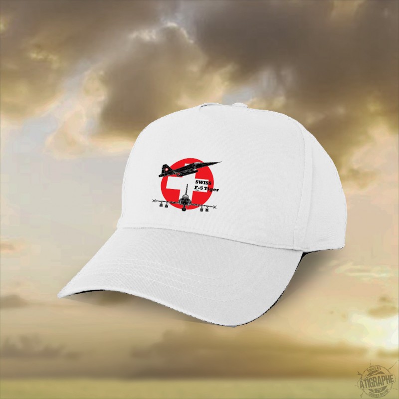 Casquette illustré de la silhouette de l'avion de combat Northrop F-5 Tiger avec les armes des ★ Forces aériennes suisses ★ en arrière-plan, version couleur.