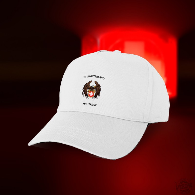 Casquette illustré d'un aigle et du blason suisse ainsi que de la citation "In Switzerland We Trust", version revisitée de la devise américaine "In God We Trust"