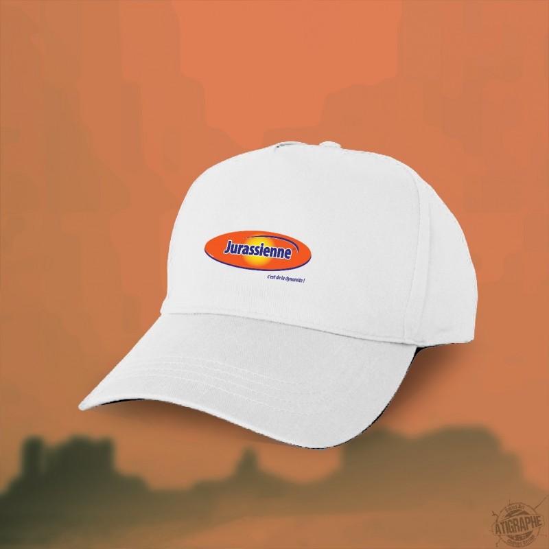 Casquette illustré de la citation ✪ Jurassienne, c'est de la dynamite ! ✪ inspiré du logo de la célèbre marque de pâtes à tartiner, de barres et de boissons à base d'oeuf, de malt et de chocolat