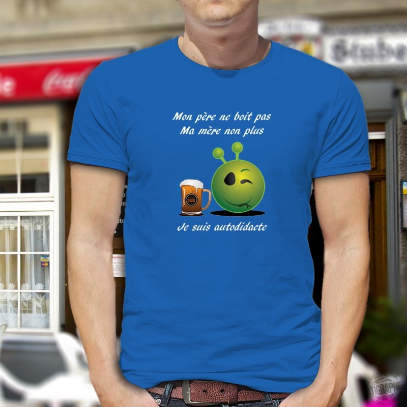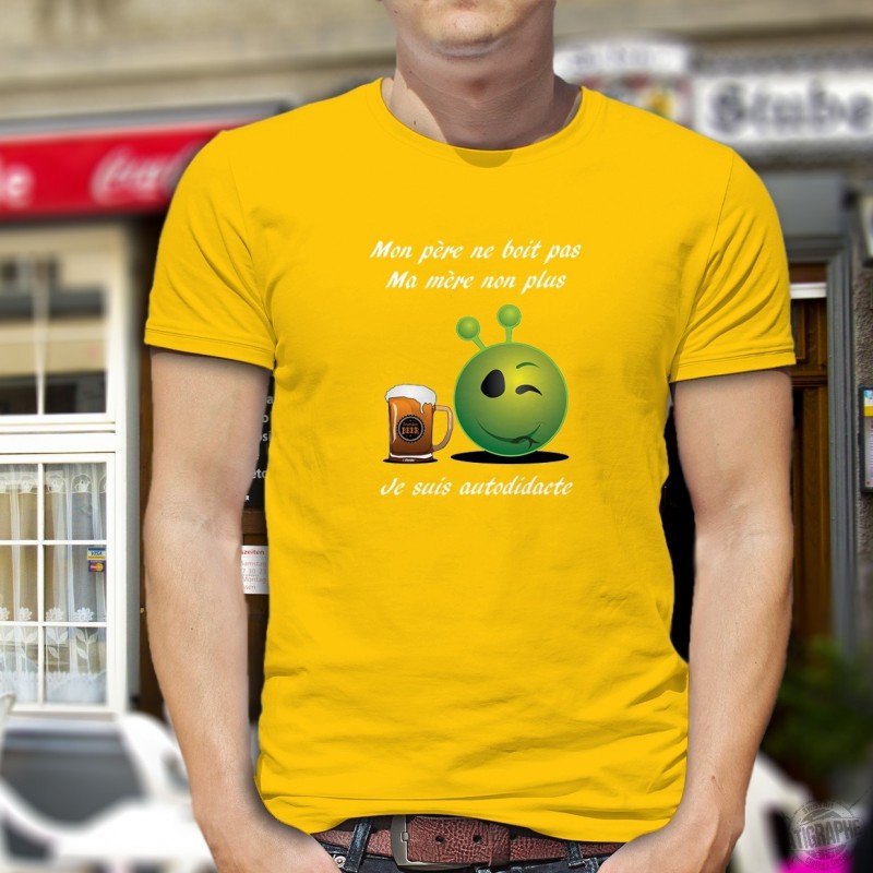 T-shirt 100% coton homme avec un Smiley extra-terrestre éméché, une chope de bière et la citation ★ Mon père ne boit pas, ma mère non plus, je suis autodidacte ★