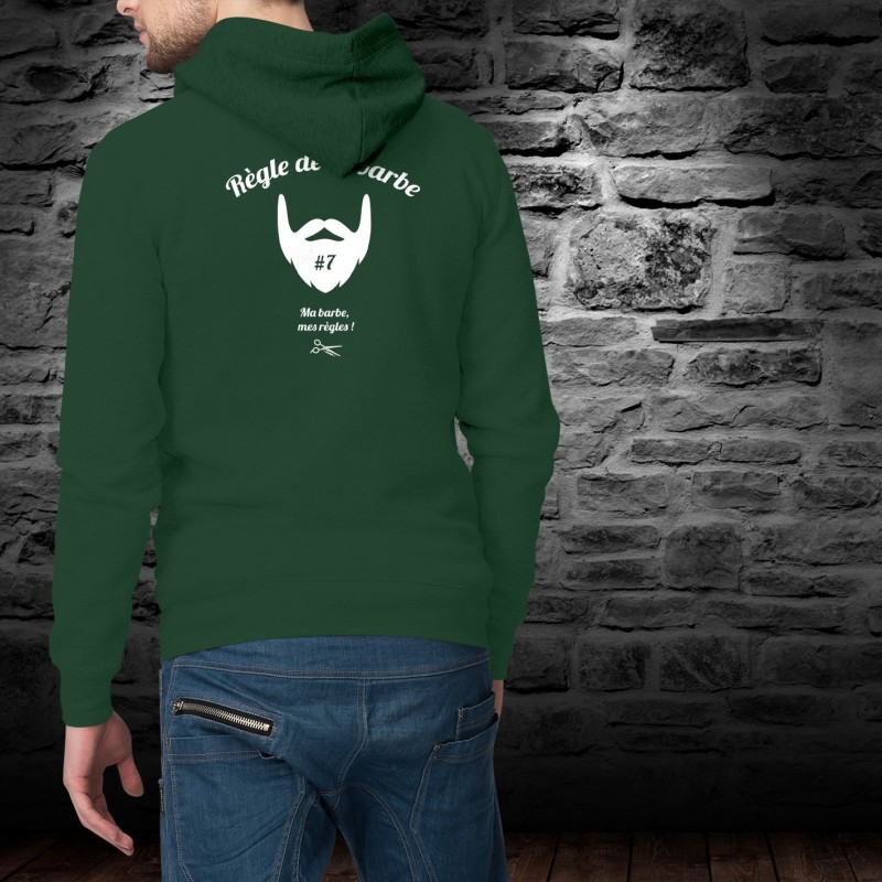 Le pull à capuche en coton pour homme arbore fièrement les expressions "Règle de la barbe N°7" et "Ma barbe, mes règles". Il est destiné à ceux qui embrassent pleinement leur style de vie barbu.