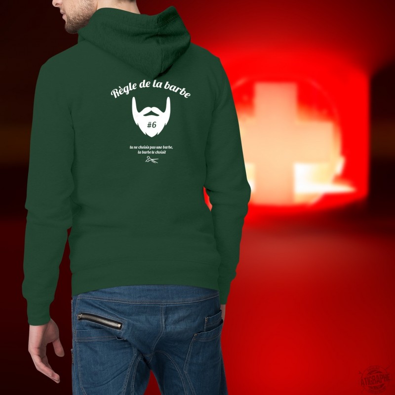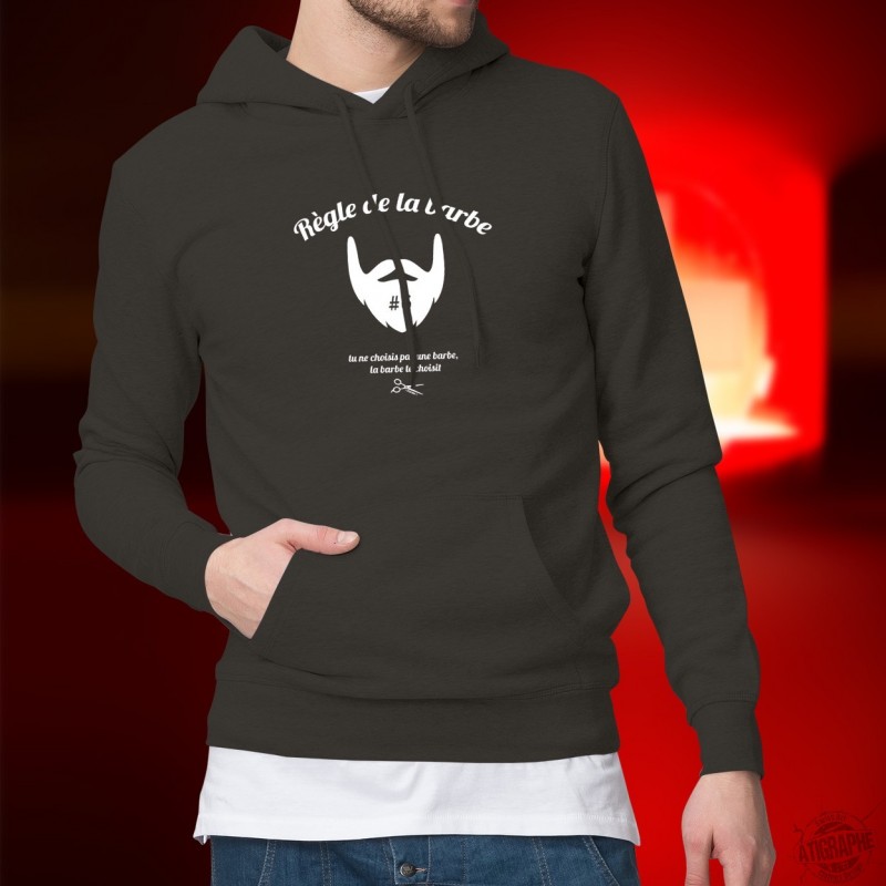 Affichez votre fierté barbue avec ce sweat à capuche homme captivant, orné de la citation de la Règle de la Barbe N°6 : "Tu ne choisis pas une barbe, la barbe te choisit", accompagnée d'un dessin élégant mettant en avant une barbe robuste.