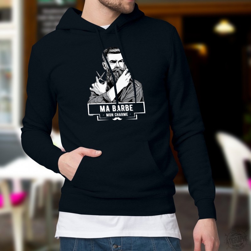 Le pull à capuche en coton pour homme avec la citation "Ma barbe, mon Charme" est bien plus qu'un vêtement ; c'est une déclaration de style pour les hommes qui cultivent leur barbe avec fierté.