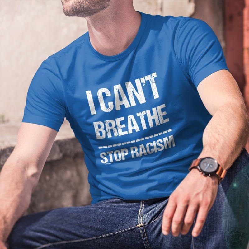 T-shirt 100% coton homme avec le slogan ✪ I can't Breathe ✪ STOP RACISM ✪. Un don de 4 CHF au GRA, Fondation contre le racisme et l’antisémitisme sera fait pour chaque T-shirt vendu, en mémoire de George Floyd et de toutes les autres victimes