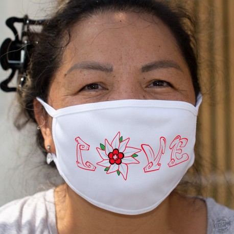 Masque de protection double couche en tissu, lavable à 60 °C illustré du mot LOVE avec le "O" représenté par une Edelweiss aux couleurs de la Suisse