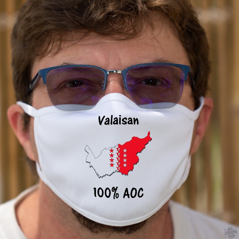 Masque de protection en tissu illustré des frontières cantonales valaisannes, du drapeau Valaisan et du slogan ✚ Valaisan 100% AOC ✚