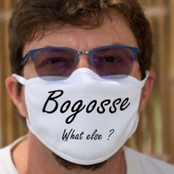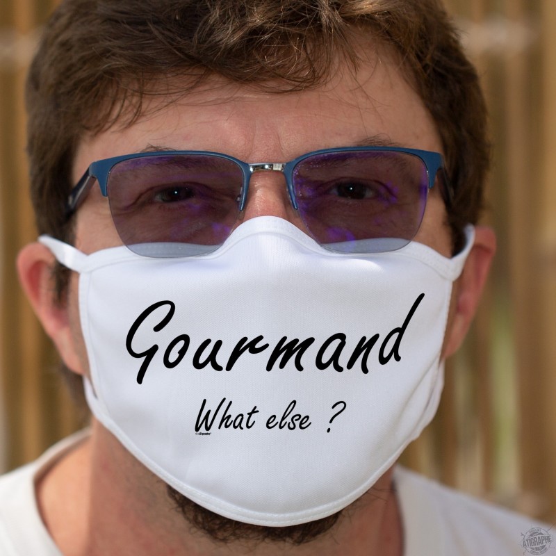 Masque protection en tissu illustré de la citation "Gourmand, What else ?" (Gourmand, quoi d'autre ?), inspiré de la phrase culte de George Clooney