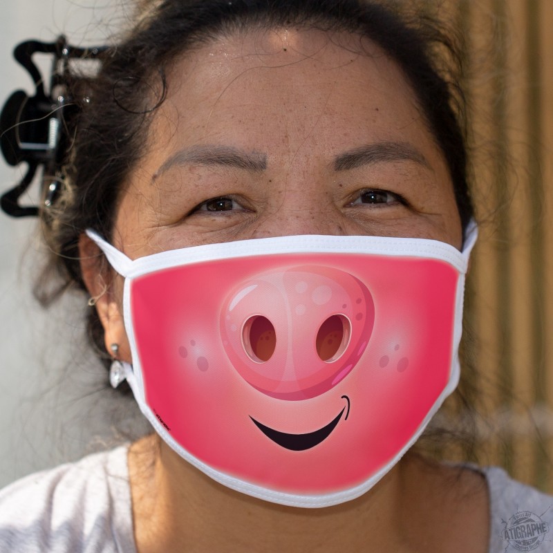 Masque en tissu double-couche, lavable, illustré du groin d'un cochon rose