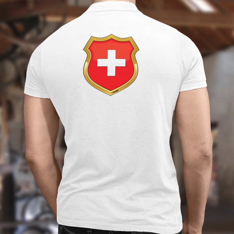 Polo homme illustré du drapeau Suisse dans un blason d'or