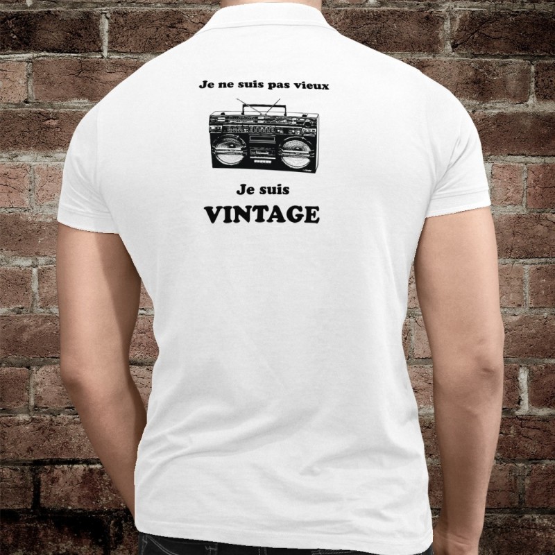 Polo humoristique mode homme illustré du slogan ★ Je ne suis pas vieux, je suis vintage ★ et d'une Ghetto blaster, lourde radio en vogue dans les années 80