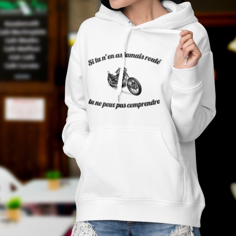 Pull blanc à capuche illustré de la citation " Si tu n'en as jamais roulé, tu ne peux pas comprendre" et d'une moto version Chopper. Car seul une vrai motarde peut comprendre