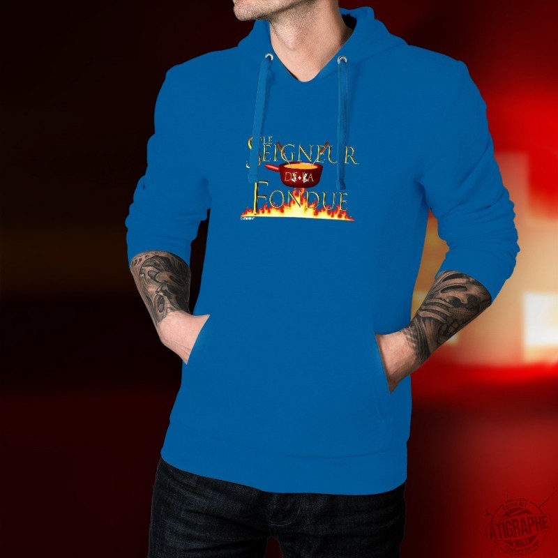 Pull à capuche, en coton, mode homme illustré d'un caquelon, de deux vaches et du titre ★ Le Seigneur de la Fondue ★ inspiré du Film " le Seigneur des Anneaux"