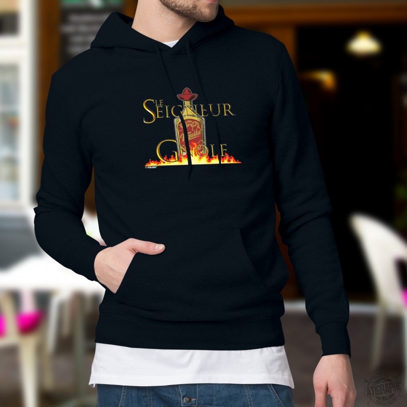 Pull à capuche, en coton, mode homme illustré d'une bouteille de Tequila et du titre ★ Le Seigneur de la Gnôle ★ inspiré du Film "le Seigneur des Anneaux"