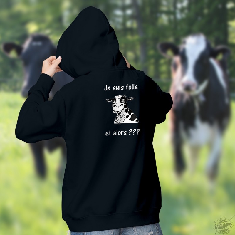 Pull à capuche, en coton, mode dame illustré d'une vache hallucinée et de la citation ✿ Je suis folle et alors ??? ✿