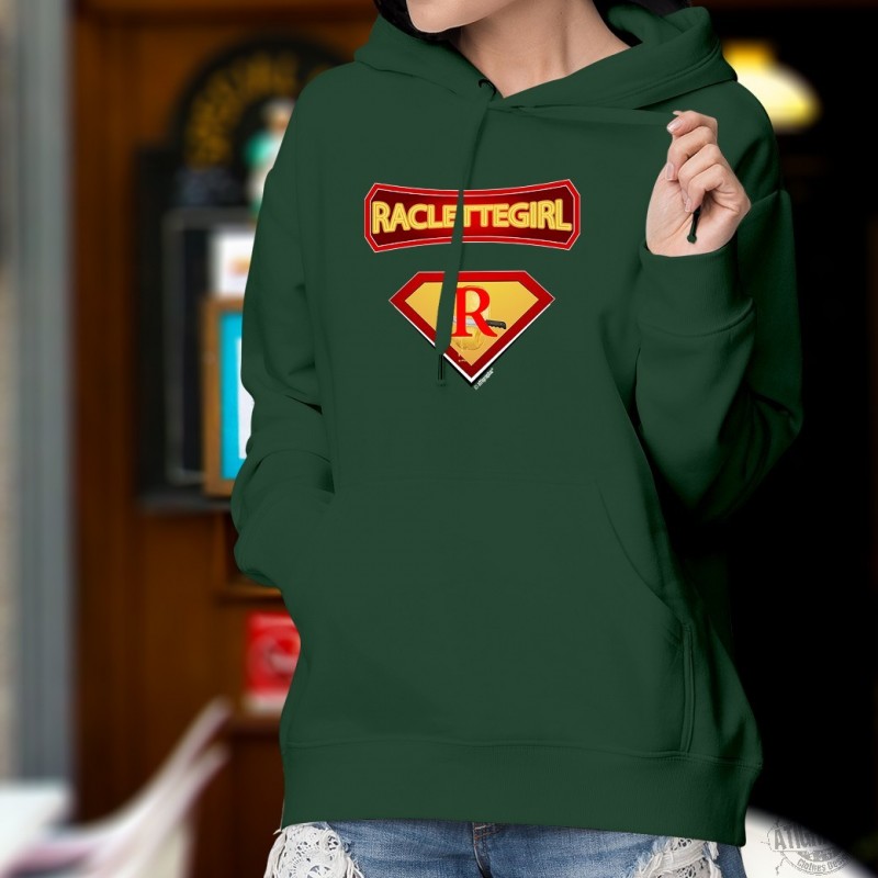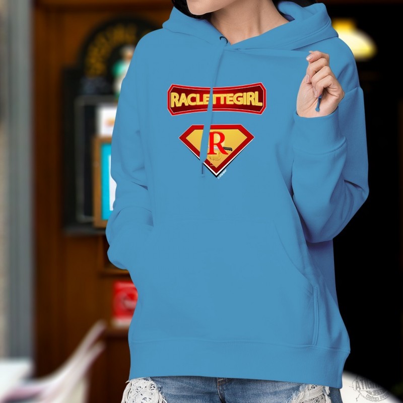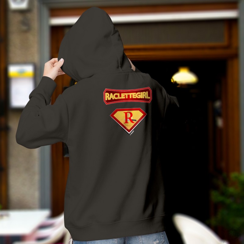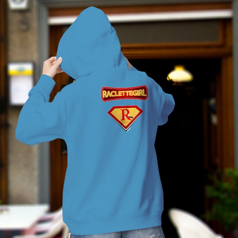 Pull à capuche coton dame avec les signes distinctifs des ✻ Super Héros ✻ des BD comics afin d'avoir de super-pouvoirs sur la Raclette et en manger à volonté