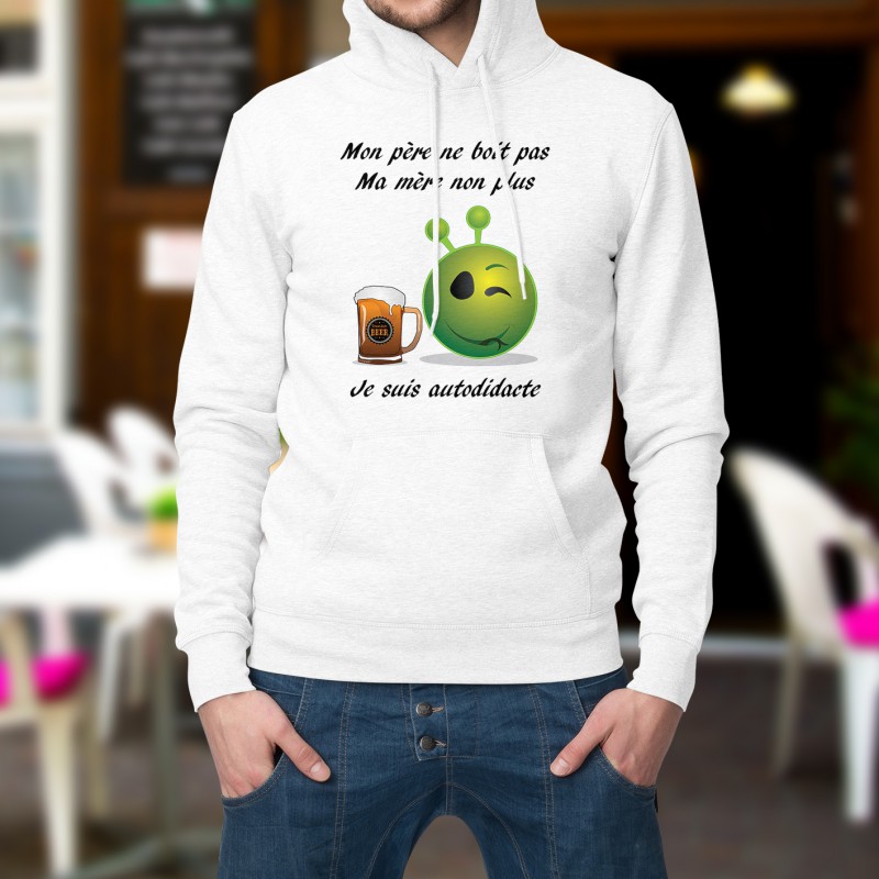 Pull humoristique blanc à capuche, pour homme, avec un smiley extra-terrestre, une chope de bière et la citation "Mon père ne boit pas, ma mère non plus, je suis autodidacte"