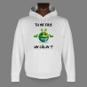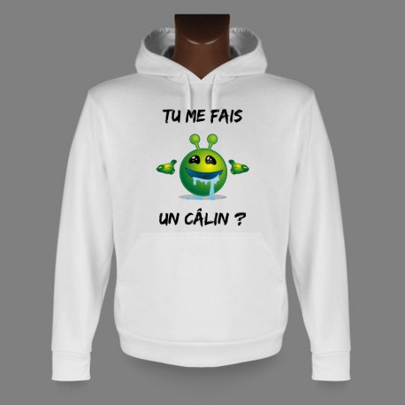 Pull blanc à capuche, pour femme ou homme, illustré de notre smiley extra-terrestre prêt pour un gros câlin et de la citation humoristique "Tu me fais un câlin ?"