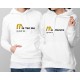 Pull humoristique blanc à capuche dame et homme DUOPACK, illustré du logo détourné d'une célèbre marque de Fastfood et de la citation "Ma Femme, Mon Homme, I'm lovin' Frais de port gratuit