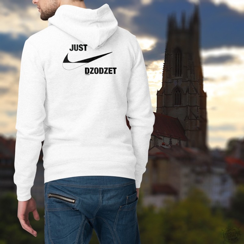 Pull-over blanc à capuche homme aux couleurs du canton de Fribourg, du logo et la phrase inspirée d'une célèbre marque de vêtements de sport ★ Just dzodzet ★