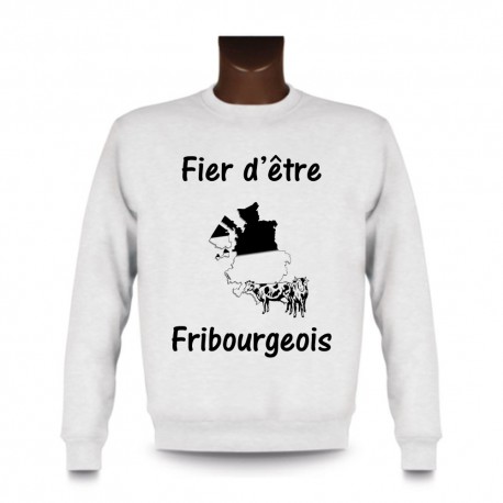 Sweat pour homme, illustré du drapeau Fribourgeois, de vaches fribourgeoises et du slogan "Fier d'être Fribourgeois"