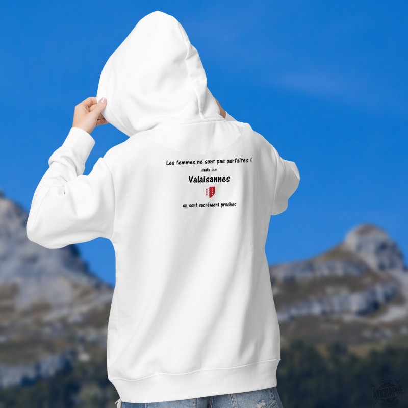 Pull-over blanc à capuche dame, avec l'écusson du canton du Valais et ❤ Les femmes ne sont pas parfaites ! mais les Valaisannes en sont sacrément proches ❤
