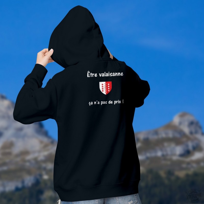 Pull à capuche en coton dame, avec l'écusson du canton du Valais et la phrase inspirée de la publicité Mastercard ★ Etre valaisanne ★ ça n'a pas de prix ! ★