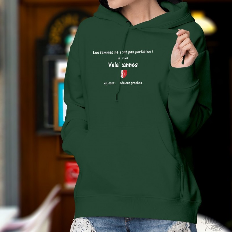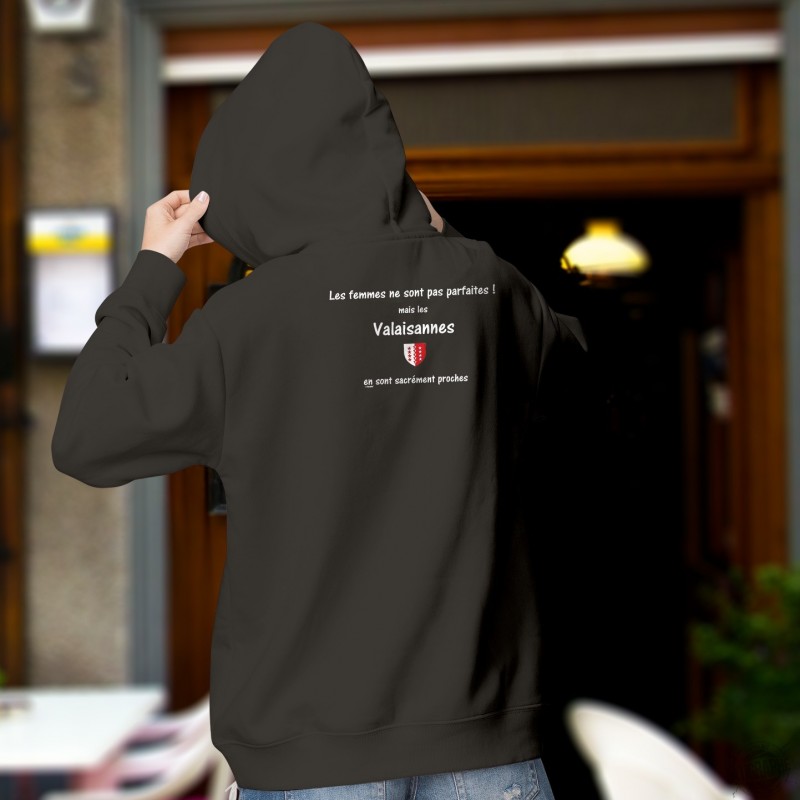 Pull à capuche en coton, dame avec la citation ✿ Les femmes ne sont pas parfaites ! mais les Valaisannes en sont sacrément proches ✿ et de l'écusson Valaisan