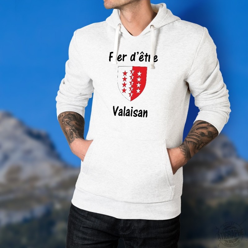 Pull-over blanc à capuche pour homme, illustré du drapeau valaisan du slogan "Fier d'être Valaisan"