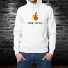 Pull blanc à capuche homme, écusson du canton de Genève en forme de pomme croquée et la phrase inspirée de la célèbre marque de smartphones ★ Think Genevois ★