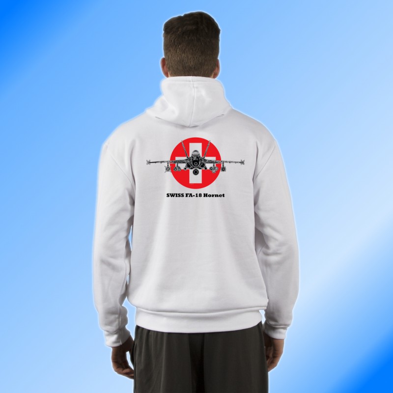 Ce sweatshirt à capuche incarne la puissance aérienne et le patriotisme avec son design audacieux mettant en vedette la silhouette distinctive d'un FA-18 Hornet en vol, avec les emblèmes des armes de la Swiss Airforce en arrière-plan.