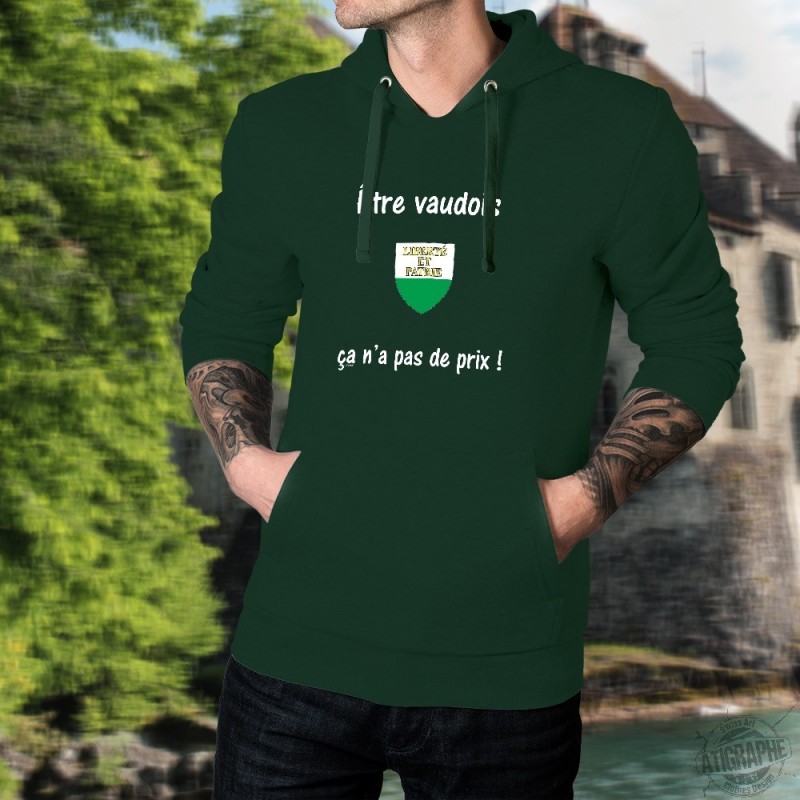 Pull à capuche en coton homme, avec l'écusson du canton de Vaud et la phrase inspirée de la publicité Mastercard ★ Etre vaudois ★ ça n'a pas de prix ! ★