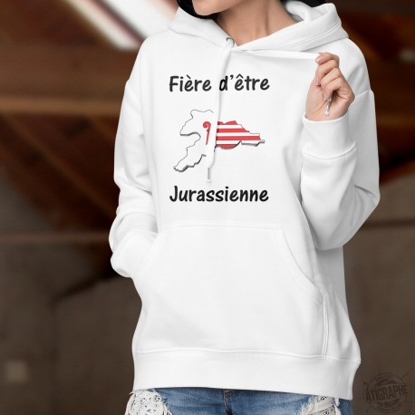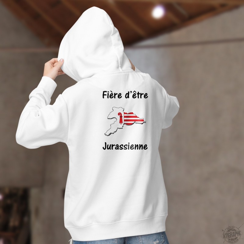 Pull-over blanc à capuche, pour dame, illustré du drapeau Jurassien en forme des frontières du canton et du slogan ★ Fière d'être Jurassienne ★