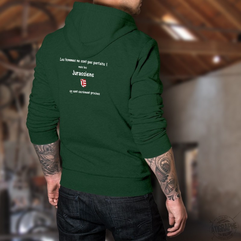 Pull à capuche, en coton, mode homme avec ★ Les hommes ne sont pas parfaits ! mais les Jurassiens en sont sacrément proches ★ et de l'écusson du canton du Jura
