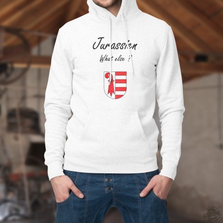 Pull-over blanc à capuche, pour homme, illustré de l'écusson du canton du jura et du texte ★ Jurassien, What else ? ★ quoi d'autre ? ★ inspiré de George Clooney