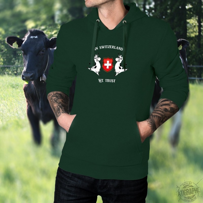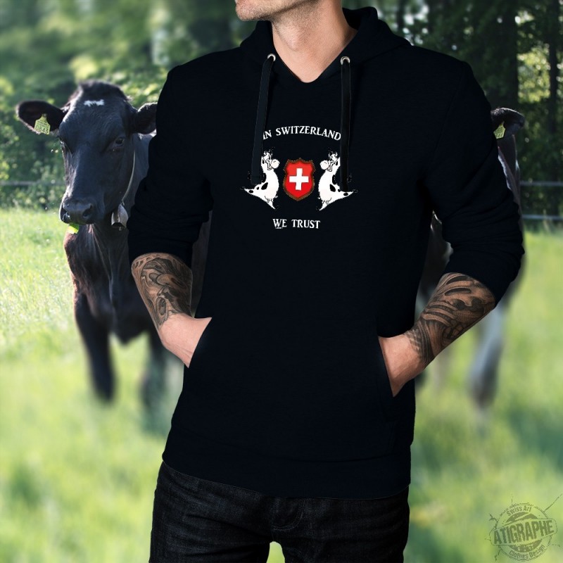 Pull-over à capuche en coton, mode homme, avec ✚ In Switzerland We Trust ✚ Nous avons confiance en la Suisse ✚ et de deux vaches Holstein joyeuses entourant l'écusson Suisse